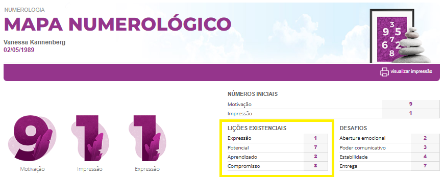 - Olhe as Lições Existenciais, bem como a Motivação e a Impressão. Os números de Expressão, Potencial, Aprendizado e Compromisso estão em destaque, como na imagem abaixo.