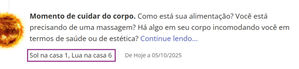 - Então, procure nos trânsitos o de “Sol na Casa…” e o de “Lua na Casa…” Na imagem abaixo, por exemplo, a pessoa está com o Sol na Casa 1 e a Lua na Casa 6.