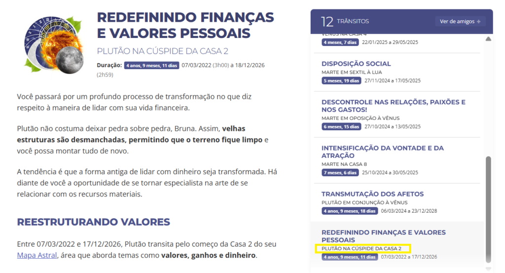 - Então, visualize todos os seus trânsitos ativos e procure para ver se encontra um onde aparece “Plutão na cúspide da Casa…”.