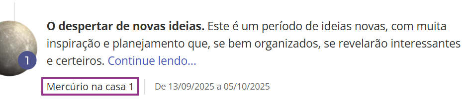 - Procure pelo trânsito de Mercúrio. Veja que o planeta estará em uma casa. No exemplo abaixo, a pessoa tem Mercúrio na Casa 1.