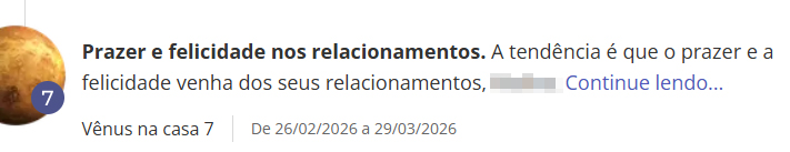 - Então, veja a lista de Trânsitos, em qual casa Vênus estará. No exemplo abaixo, que a pessoa estará com Vênus na Casa 7.